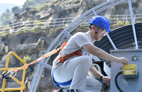 在水电站中,高处设备检修工作时刻彰显着重要性。工人佩戴着防坠器和安全带,这些小小的装备如同忠诚的卫士,紧紧守护着他们的安全,为防止高空坠落织就了一张坚固的安全网,确保每一次作业都能在安全的轨道上进行。